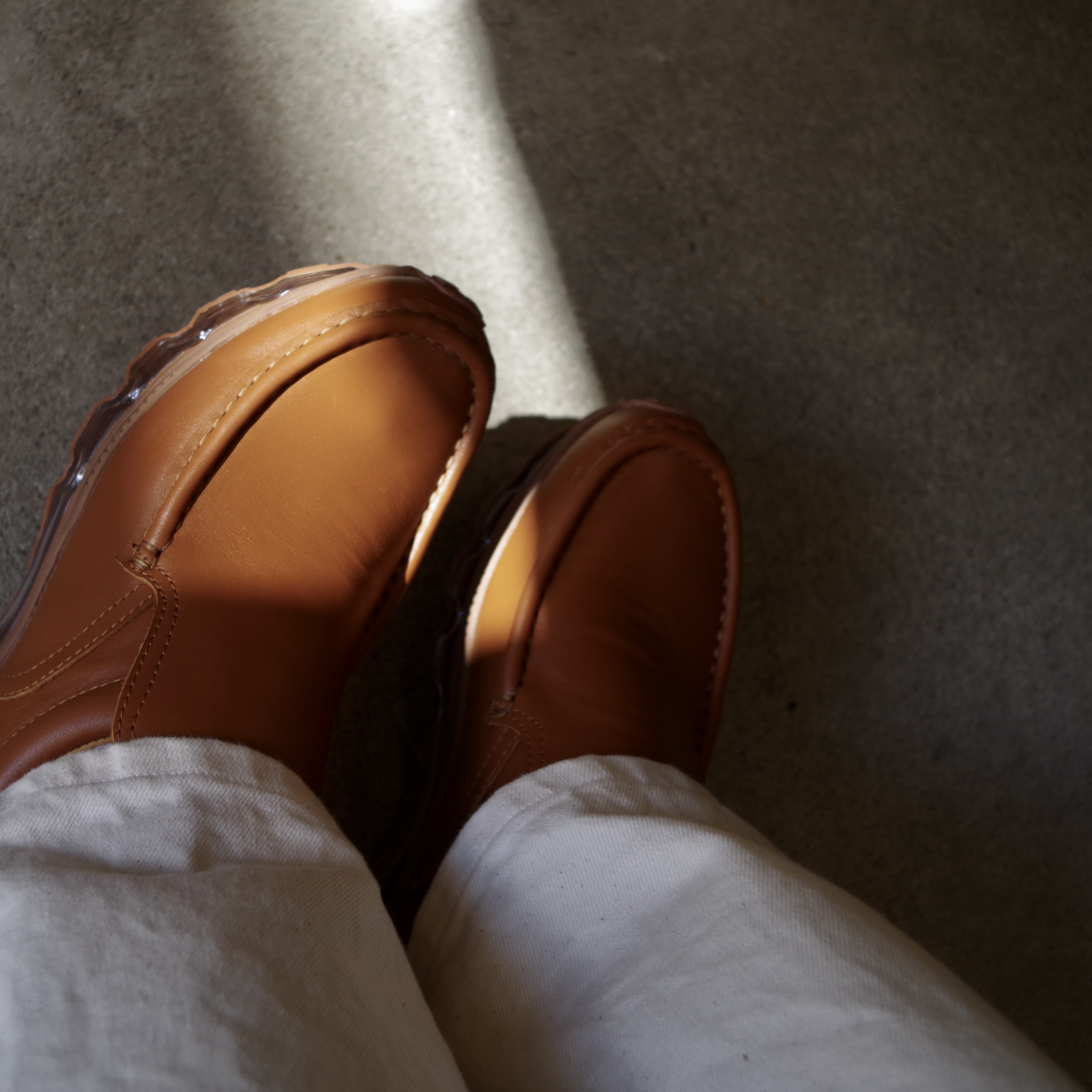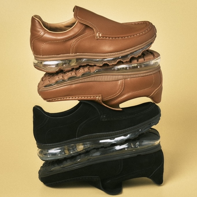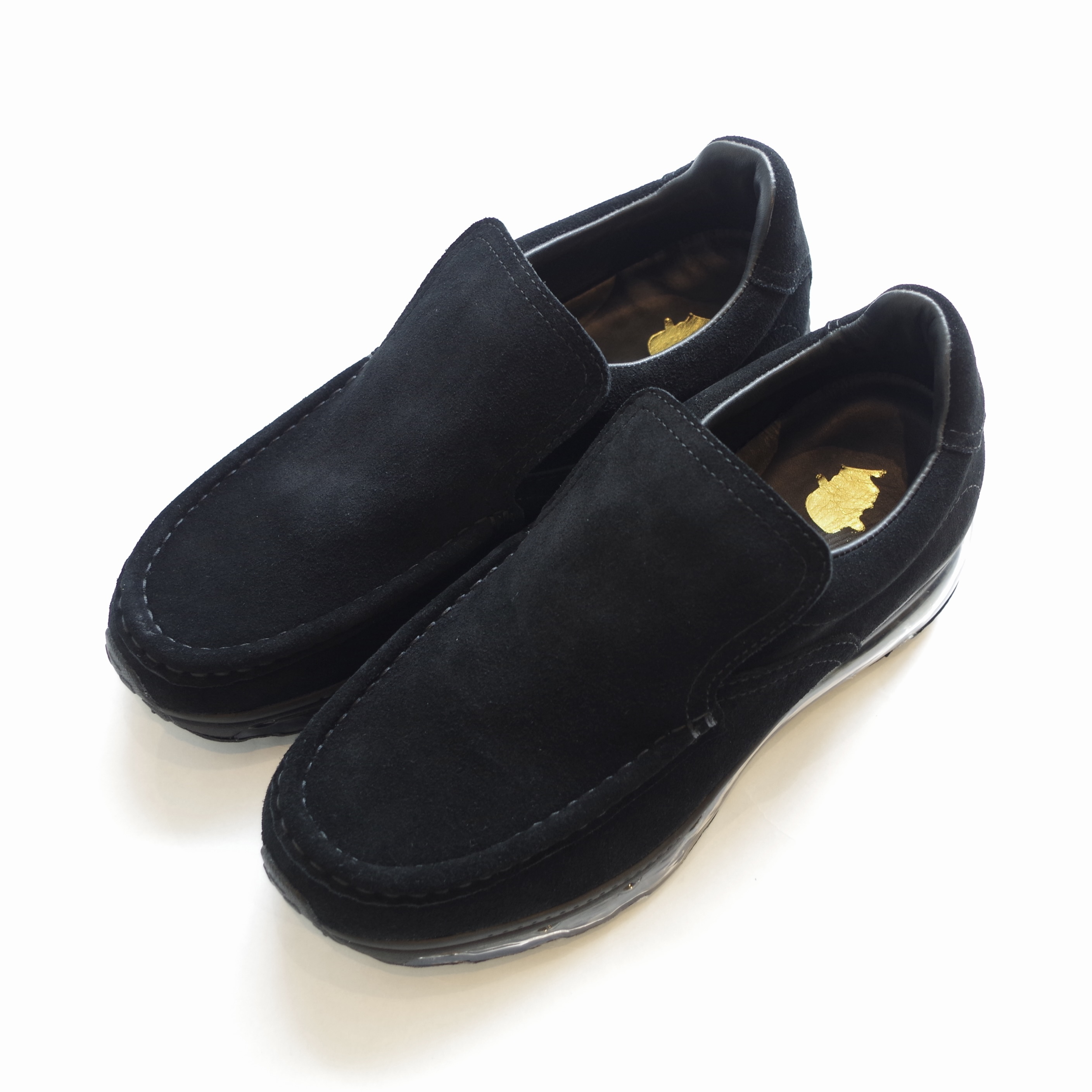 カーフレザーと毛足の短い裏面にレジン加工を施した上質なスエード使用したスリップオンタイプのスニーカー。